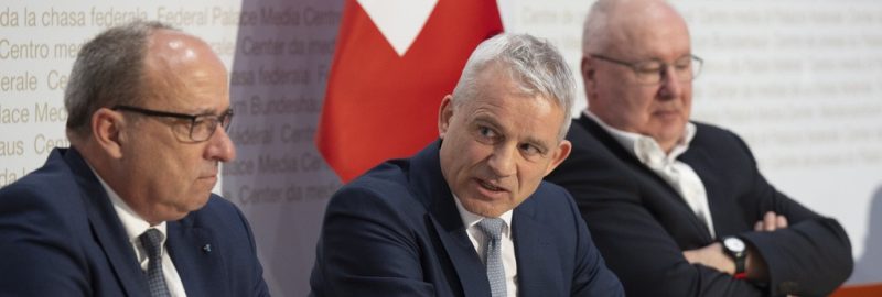 Le conseiller fédéral Beat Jans, entouré par le président de la conférence des gouvernements cantonaux Markus Dieth et le président de l'Union syndicale suisse Pierre-Yves Maillard (Keystone)