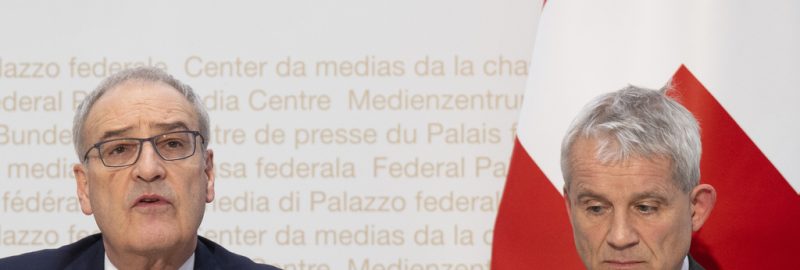 Le président de la Confédération Guy Parmelin (à gauche) et le ministre de la justice Beat Jans lors de la conférence de presse sur l'aide aux victimes de l'incendie de Crans-Montana, le 25 février 2026 à Berne. (KEYSTONE/Peter Schneider)
